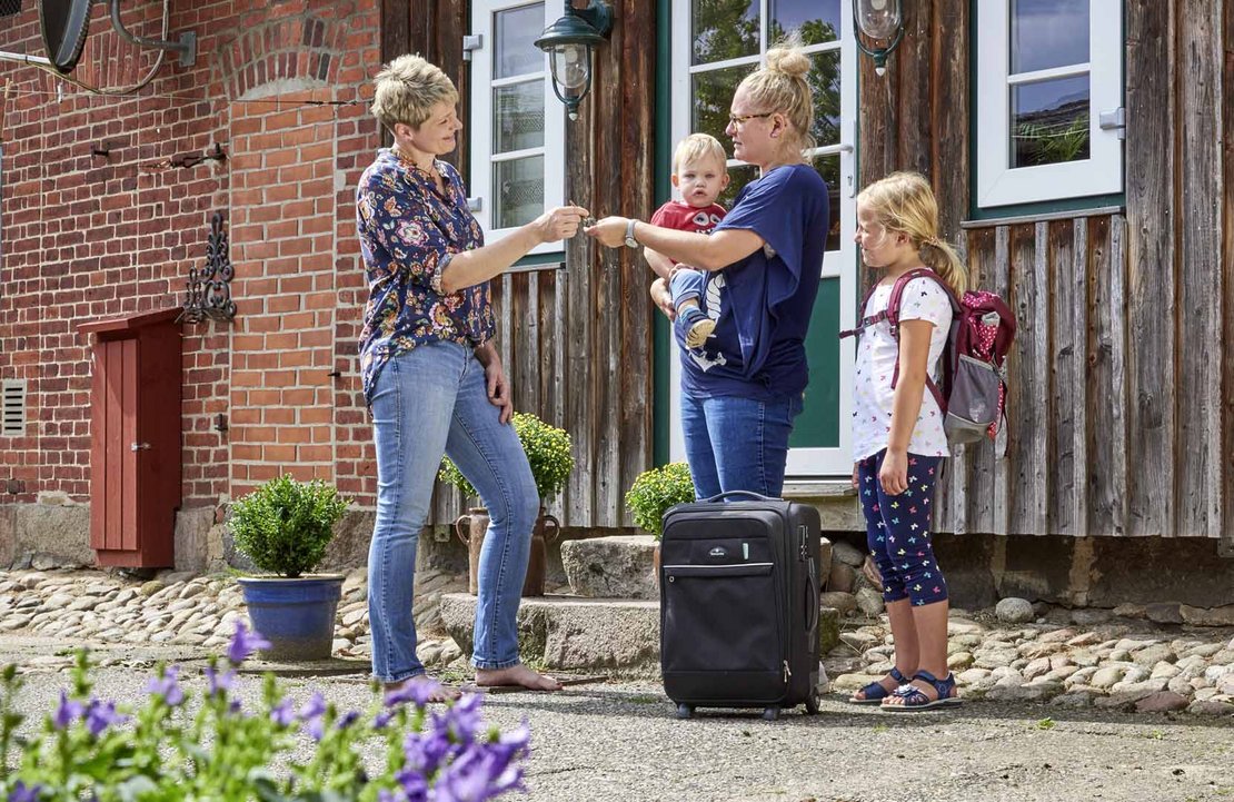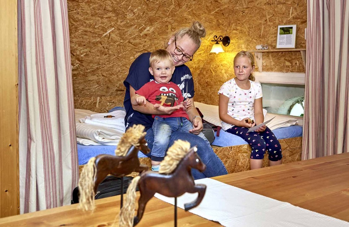 Inken Mohr entschuldigt sich kurz bei uns, um Familie Arelt aus Greifswald zu begrüßen, die für ein paar Tage das Alkoven-Quartier unter dem Dach des historischen Reetdachhauses gemietet hat. Tochter Lotta ist ganz begeistert von dessen kleinen Schlafbuchten mit Namen Ferkelbucht, Lämmerschlupf, Pferdebox und Hühnerstall.