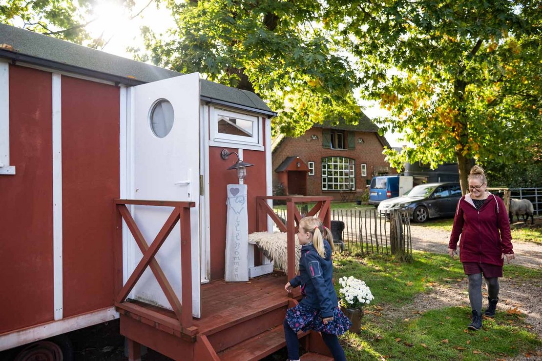 Wer möchte, kann auf dem Arche-Hof Bredland auch in einem Schäferwagen übernachten. „Paare lieben diesen urigen Wagen, der in einem Gärtchen mit Blick auf die Schafskoppel steht,“ sagt Inken Mohr. Er ist hell und echt muggelich, besitzt eine kleine Sitzgelegenheit, eine Kochzeile sowie ein kleines Bad.