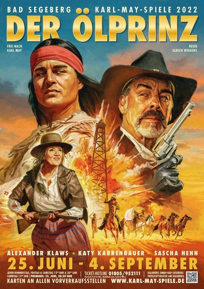 From 25 June to 4 September 2022, the Karl May Festival plays in Bad Segeberg will be presenting the exciting adventure "The Oil Prince" at the open-air theatre on the Kalkberg. Performances are on Thursday, Friday and Saturday at 3.00 pm and 8.00 pm and on Sunday at 3.00 pm. Alexander Klaws verkörpert zum zweiten Mal die Rolle des edlen Apachenhäuptlings Winnetou. Die diesjährigen Gaststars sind Sascha Hehn als gewissenloser Ölprinz und Katy Karrenbauer als unerschrockene Treckführerin Rosalie Ebersbach.