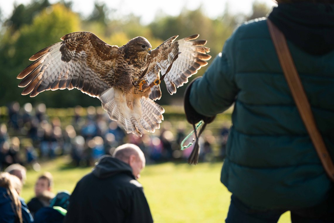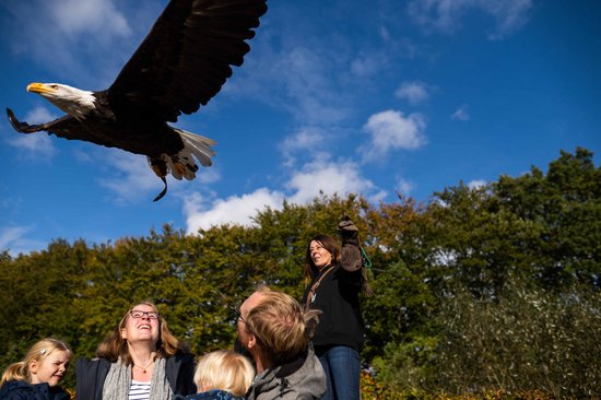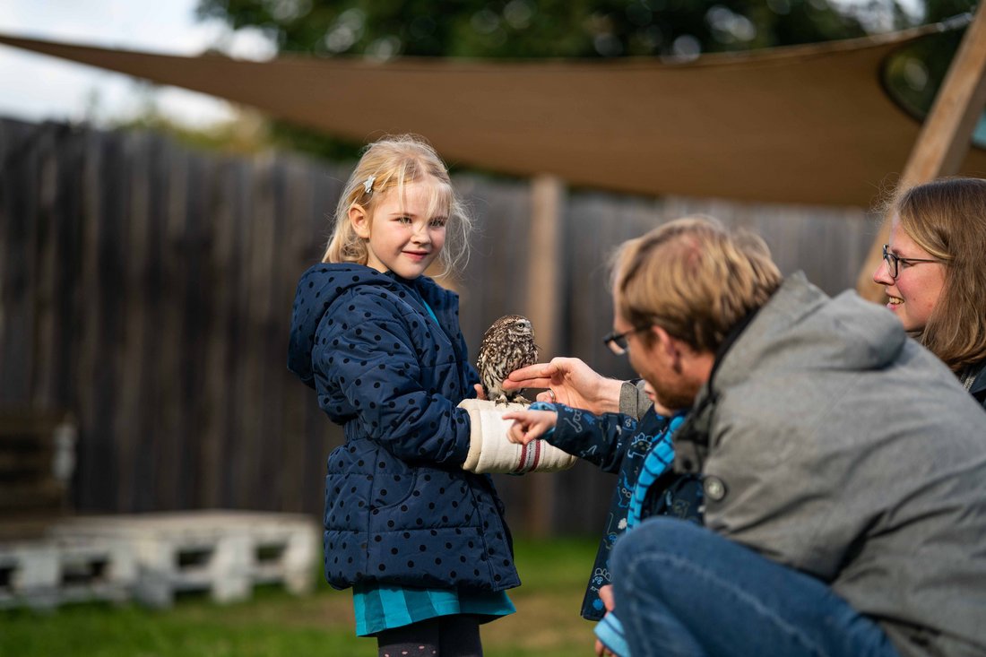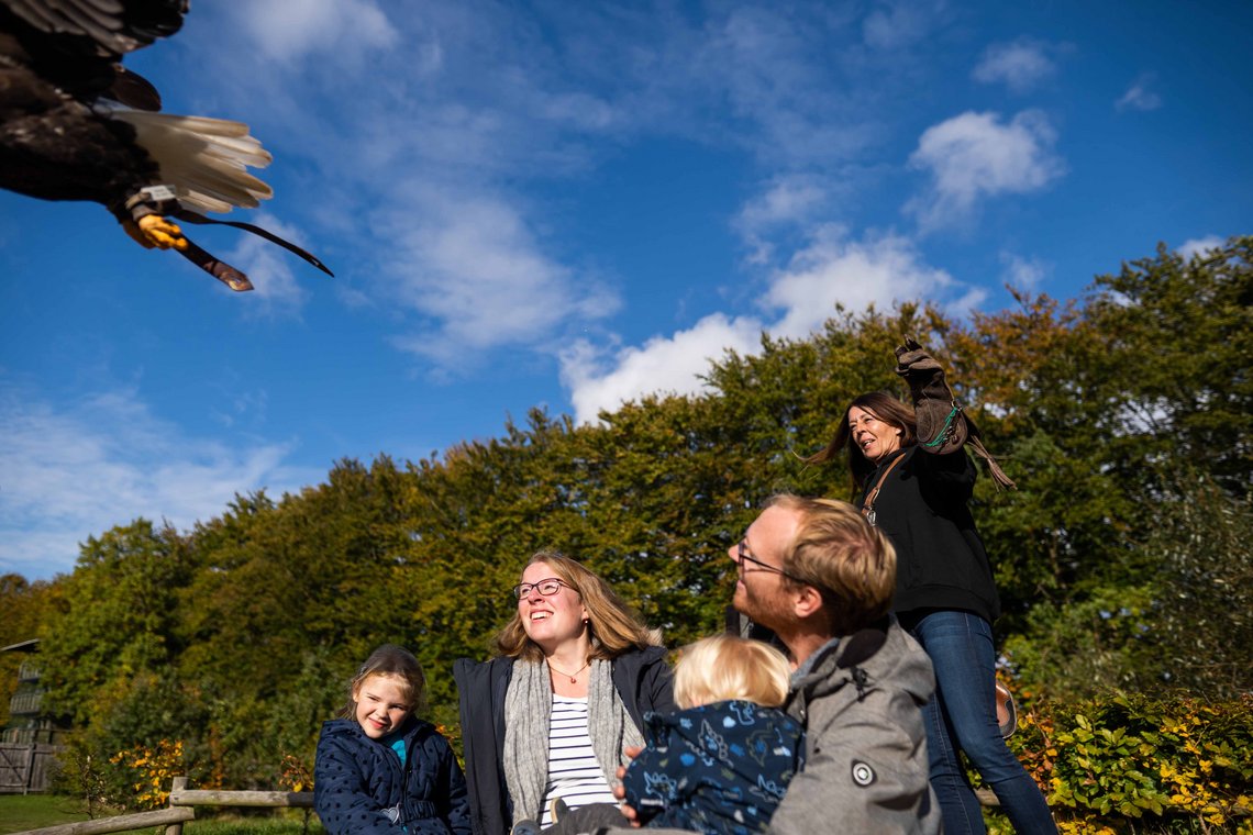Alexandra Schütt lebt für ihre Vögel. „Sie sind meine Passion, mein Leben“, sagt die Falknerin. Mit ihrem Lebensgefährte Dietmar Damm wohnt Alexandra auf dem Gelände des Erlebnsiwaldes Trappenkamp, ganz nah bei ihren Tieren. „Feierabend gibt es bei uns nicht. Urlaub schon gar nicht.“ Die 70 Vögel wollen rund um die Uhr versorgt werden. An diesem letzten Oktoberwochenende verabschiedet sich das Team vom Greifvogelzentrum Schleswig-Holstein mit einer letzten Flugschau in den Winter. Der ErlebnisWald Trappenkamp wiederum ist das ganze Jahr über geöffnet. So können kleine und große Gäste die heimischen Tiere zu allen Jahreszeiten und bei verschiedenen Witterungsverhältnissen ganz nah erleben, beobachten und dabei jede Menge über die hier lebenden Tierarten erfahren. „Auf diese ganz spielerische Art, lässt sich Biologie näherbringen“, freut sich Alexandra Schütt.
