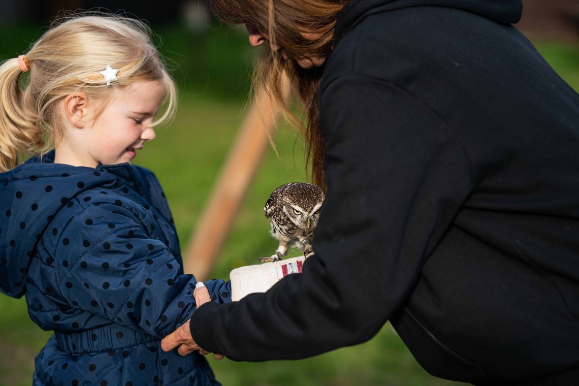 Bambam, dem Kauz mit dem Alexandra die ganze Zeit spazieren geht, merkt man nicht an, dass er eigentlich ein Wildvogel ist. Sein Lederriemen, im Fachjargon das Geschüh, scheint ihn nicht zu stören. „Er ist ihn seit seiner ersten Woche gewohnt. Das ist auch die Zeit, in der er das erste Mal auf den Handschuh fliegt, sich an das Leder gewöhnt und wir ihn mit Geflügel und Leckerli locken. Der Handschuh wird schnell sein Zuhause. Hier soll er sich sicher fühlen.“, sagt die Greifvogel-Expertin. Im Laufe des Trainings vergrößert sich dann die Distanz zwischen Vogel und dem Handschuh.